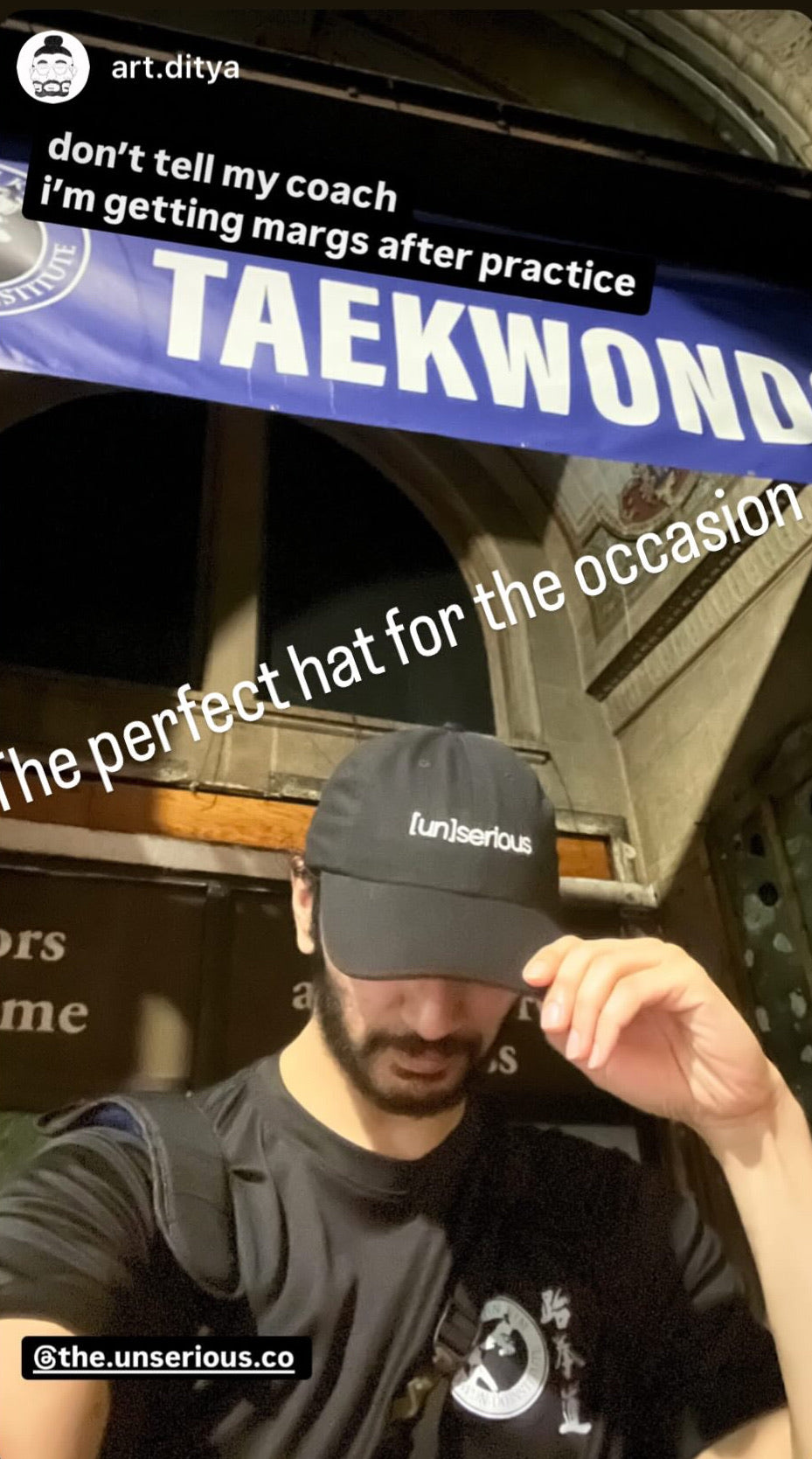 Our Chief Design Officer shows off the [un]serious everyday cap post-taekwondo and pre-margs.